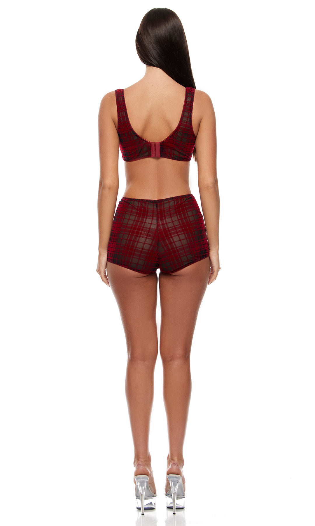 Velvet Lines Plaid Mesh Bralette and Briefs Set - Red
