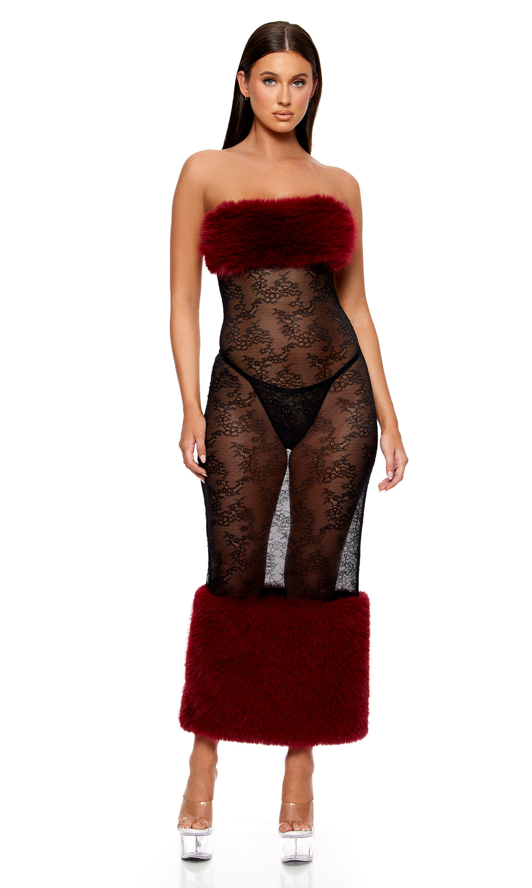 Fur The Night Lace and Faux Fur Nightgown Set - Wine