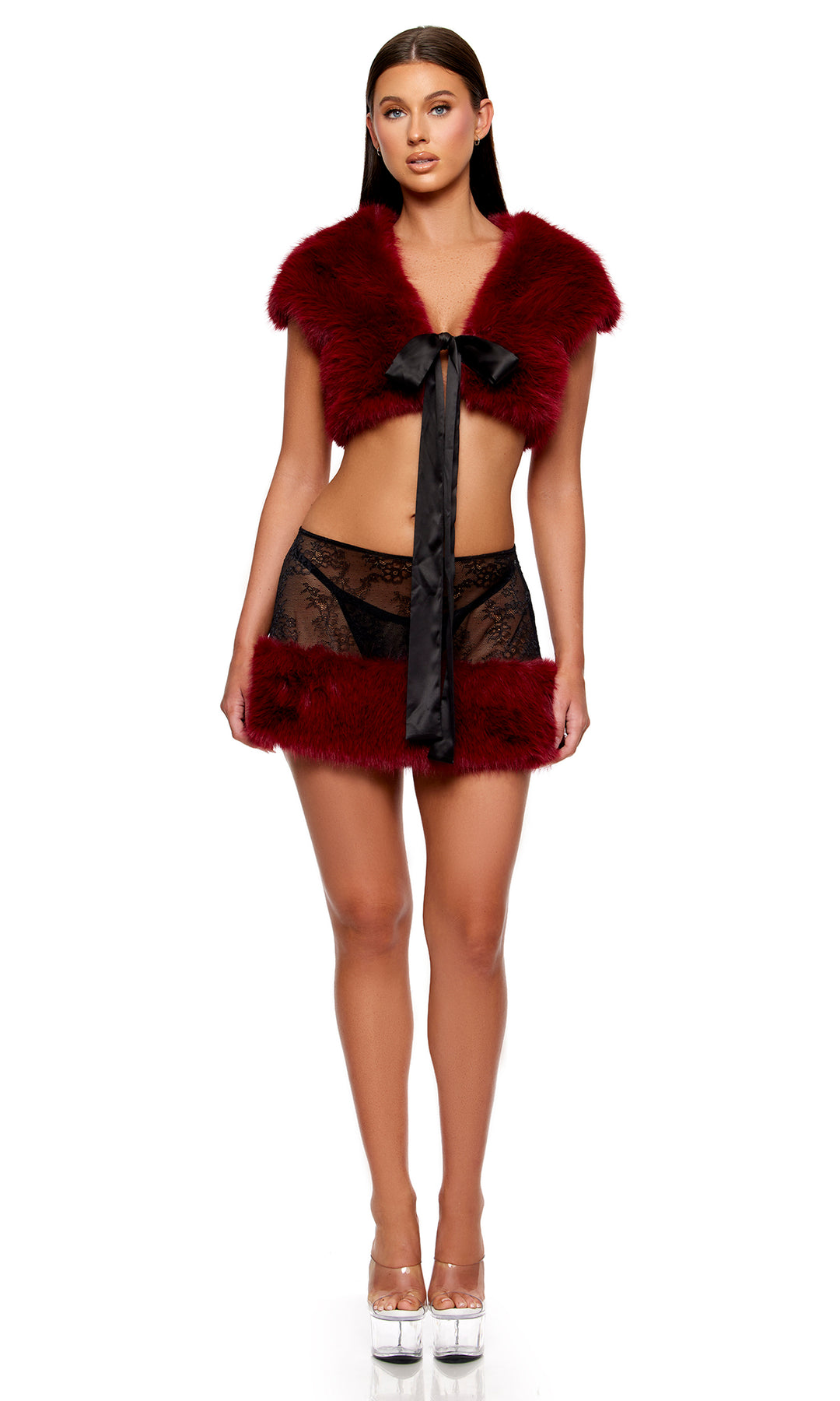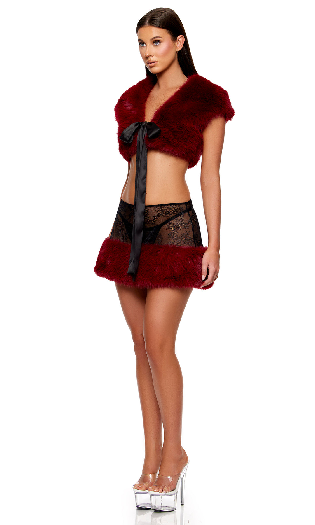 Fur The Night Lace and Faux Fur Shrug and Mini Skirt Set - Wine